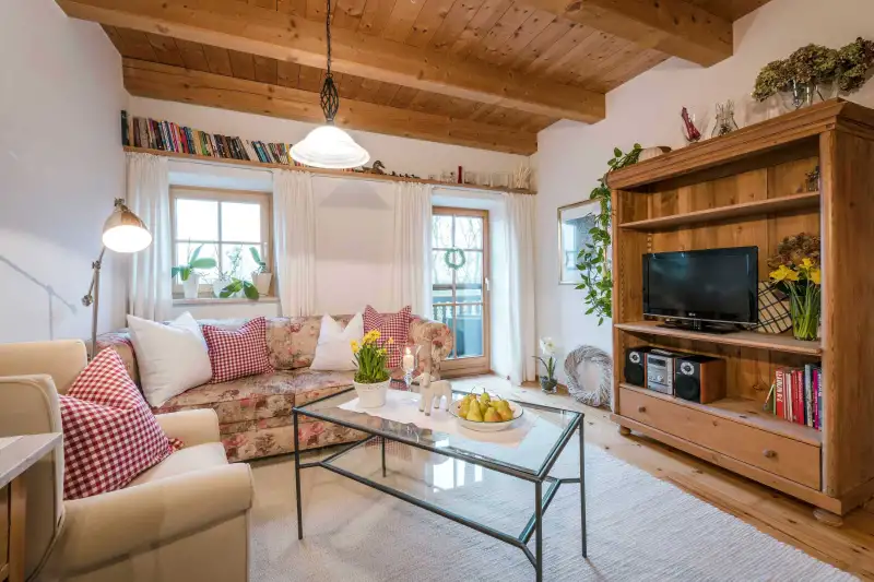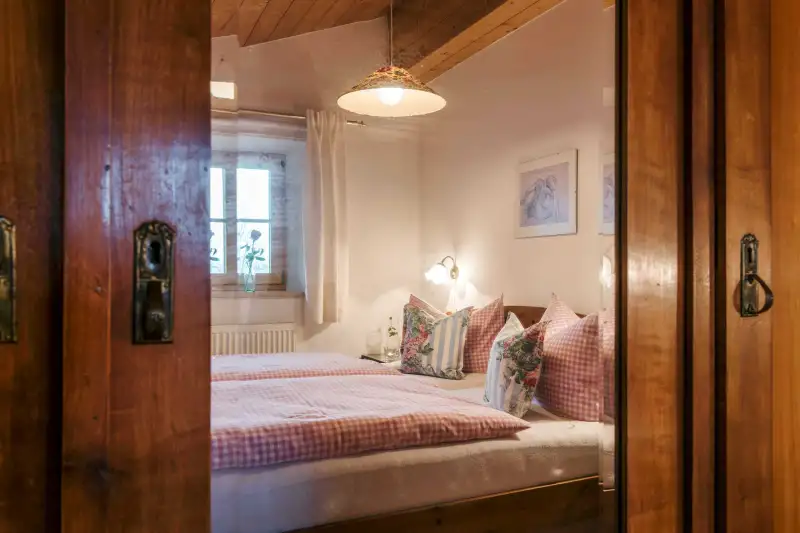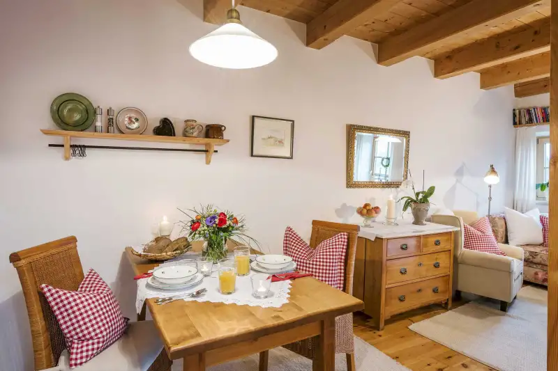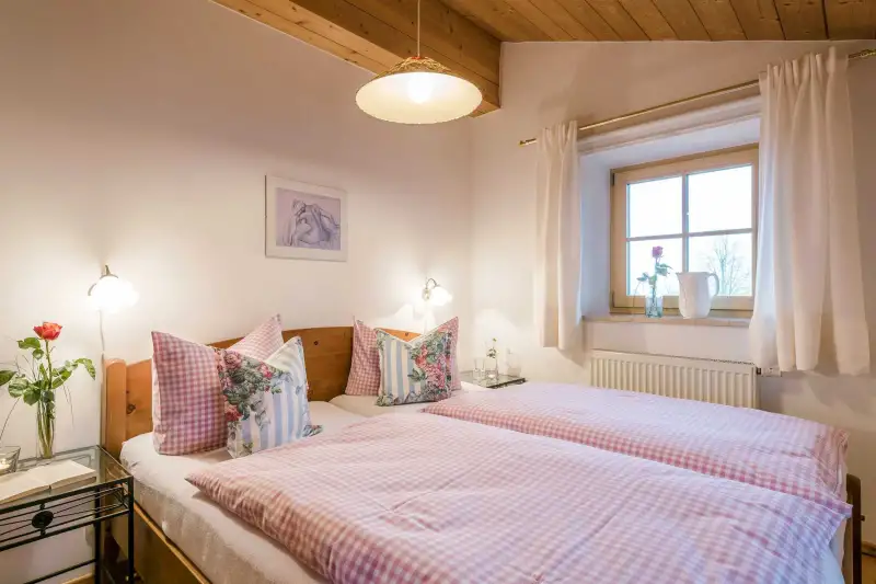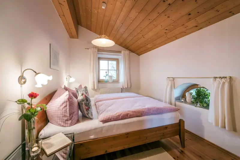 Die 58 Quadratmeter große 5-Sterne-Ferienwohnung Bauerngarten befindet sich im zweiten Stock. Der gemütliche Wohn- und Essbereich mit heimelig anmutender Holzbalkendecke und einem gemütlichen Sofa strahlt rustikal-bayerisches Flair aus. Vom Ostbalkon aus genießt du einen herrlichen Blick mitten in die Natur. Die Nichtraucher-Ferienwohnung ist geschmackvoll und mit viel Liebe zum Detail ausgestattet. Hier wirst du dich sofort wie zu Hause fühlen. Das ist Landurlaub vom Feinsten in einzigartiger Umgebung.