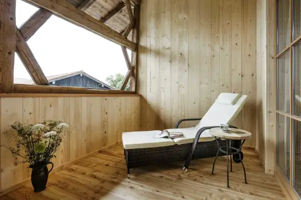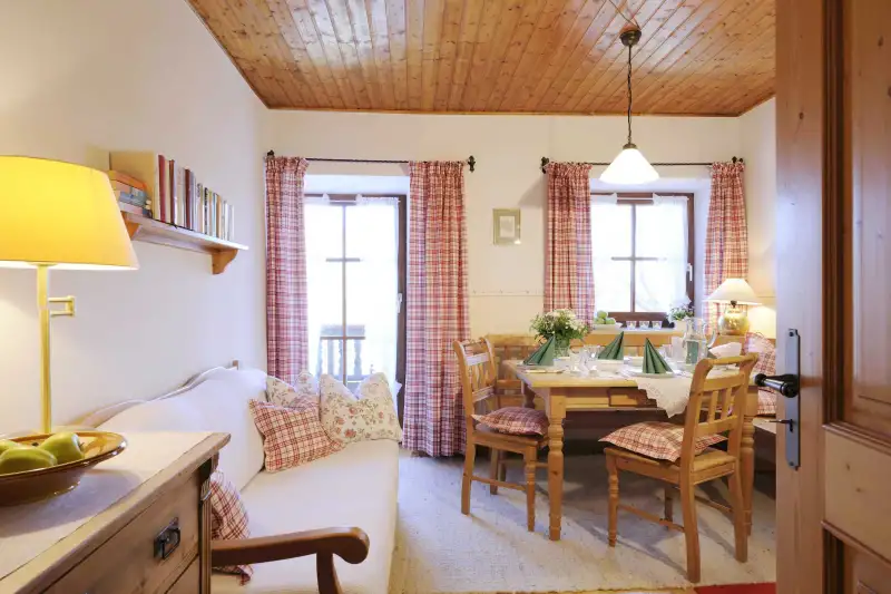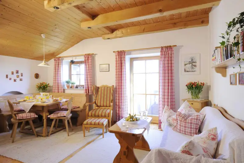 Die 72 Quadratmeter große 5-Sterne-Ferienwohnung Getreidekammer befindet sich im ersten Stock und bietet auf zwei Etagen ausreichend Platz für bis zu 2 Erwachsene und 3 Kinder. Die von heimischen Schreinern gefertigten Echtholzmöbel strahlen in Kombination mit dem Chiemgauer Kachelofen Wärme und Behaglichkeit aus. Auf dem Südbalkon der Nichtraucher-Ferienwohnung lässt es sich auf zwei bequemen Relaxliegen herrlich entspannen. Die offene Bauweise und der lichtdurchflutete, gemütliche Wohn- und Essbereich sorgen für ein behagliches Ambiente. In den zwei liebevoll bis ins Detail ausgestatteten separaten Schlafzimmern fühlst du dich sofort wie zu Hause. Das luxuriös ausgestattete Badezimmer mit begehbarer, bodengleicher Dusche ist eines der Highlights dieser Ferienwohnung, die keine Wünsche offen lässt. Das ist Landurlaub vom Feinsten in einzigartiger Umgebung.